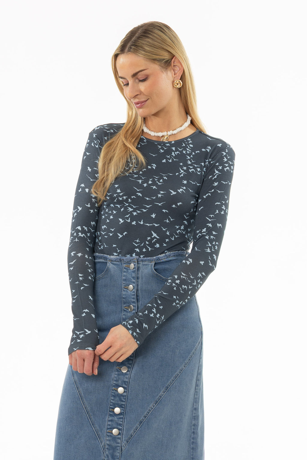 The bird print adds character to a classic tee shape. Easy to tuck into skirts for a playful daytime look. Comfortable for warm weather and simple to style. A casual piece that still stands out.