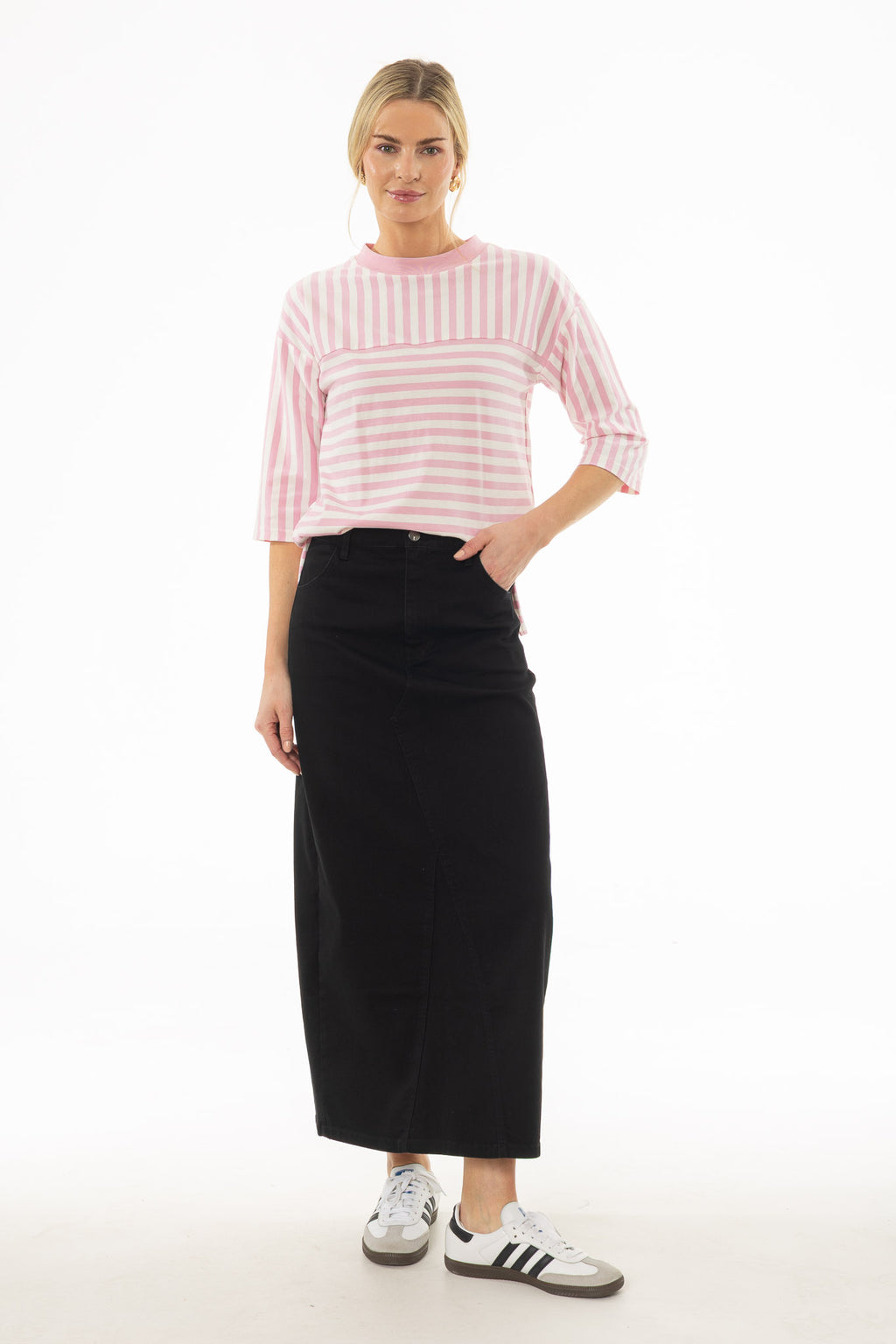 A classic denim maxi skirt that works with everything in your summer closet. Style it with a tucked tee or breezy blouse for days spent walking along the boardwalk or browsing local shops.