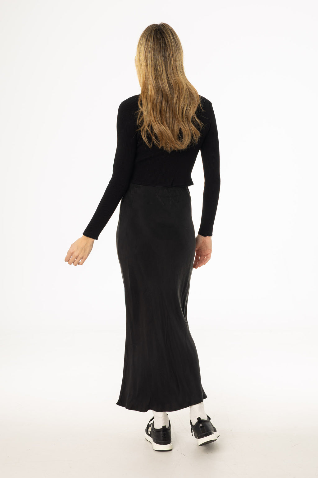 A timeless piece with just the right sheen. Easy to pair with chunky sweaters, slip blouse, or even a blazer, it slides into any wardrobe rotation. Its clean shape makes it wearable year-round. You’ll find yourself styling it in more ways than you thought possible.