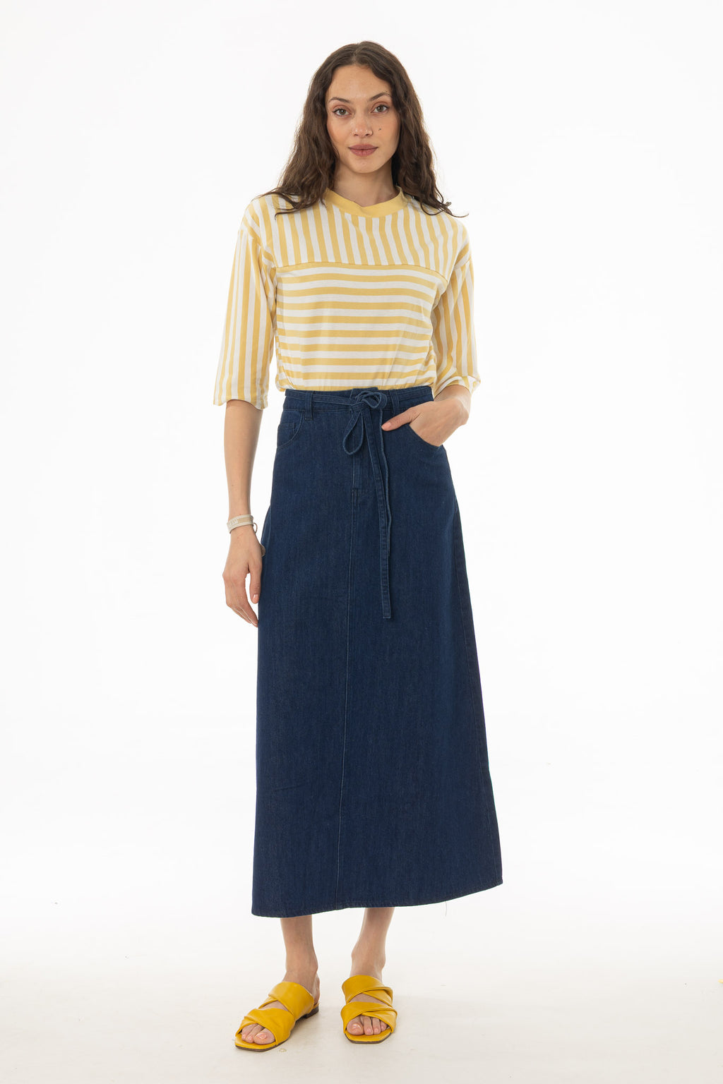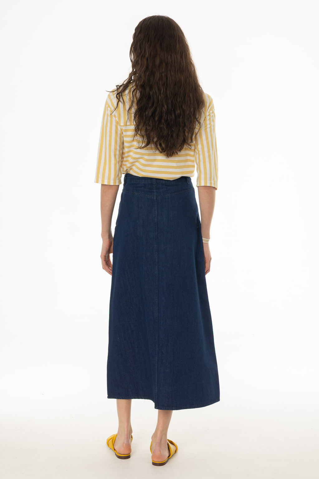 An A-line denim skirt that gives a clean, flattering shape. Style it with a light blouse or graphic tee for museum visits or city strolls. A dependable piece that works across the season.
