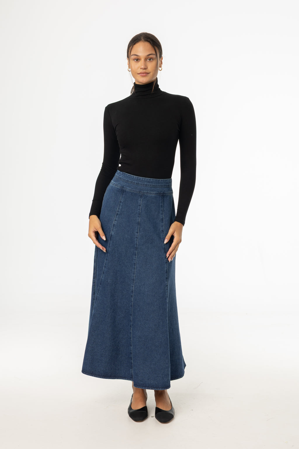 Denim, but with a little drama. This maxi skirt flows with movement while keeping the grounded feel of denim. Perfect with chunky sweaters or tucked-in tops, it’s a piece you’ll wear everywhere from casual Fridays to weekend coffee runs. Comfort meets style in a way you’ll keep reaching for.