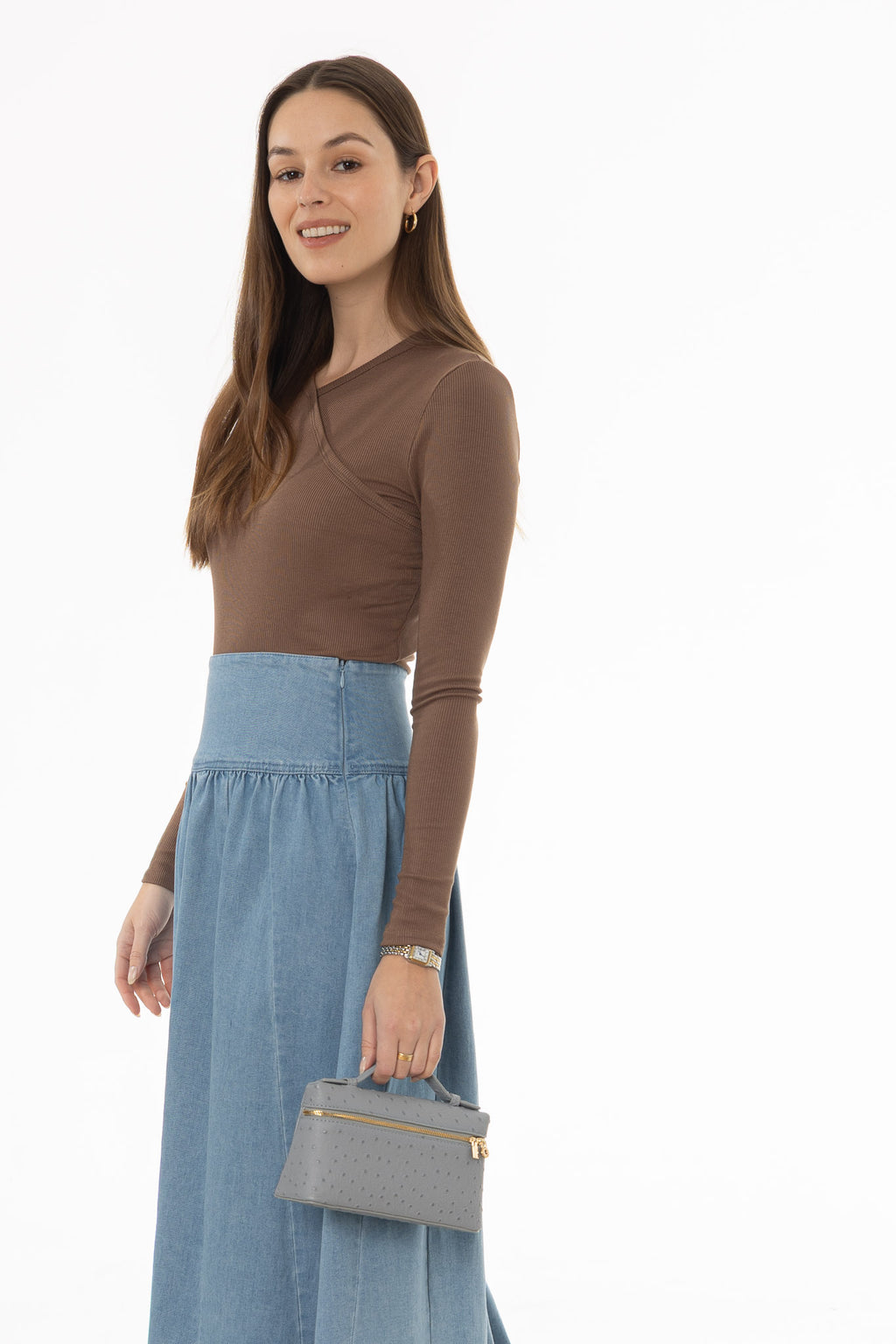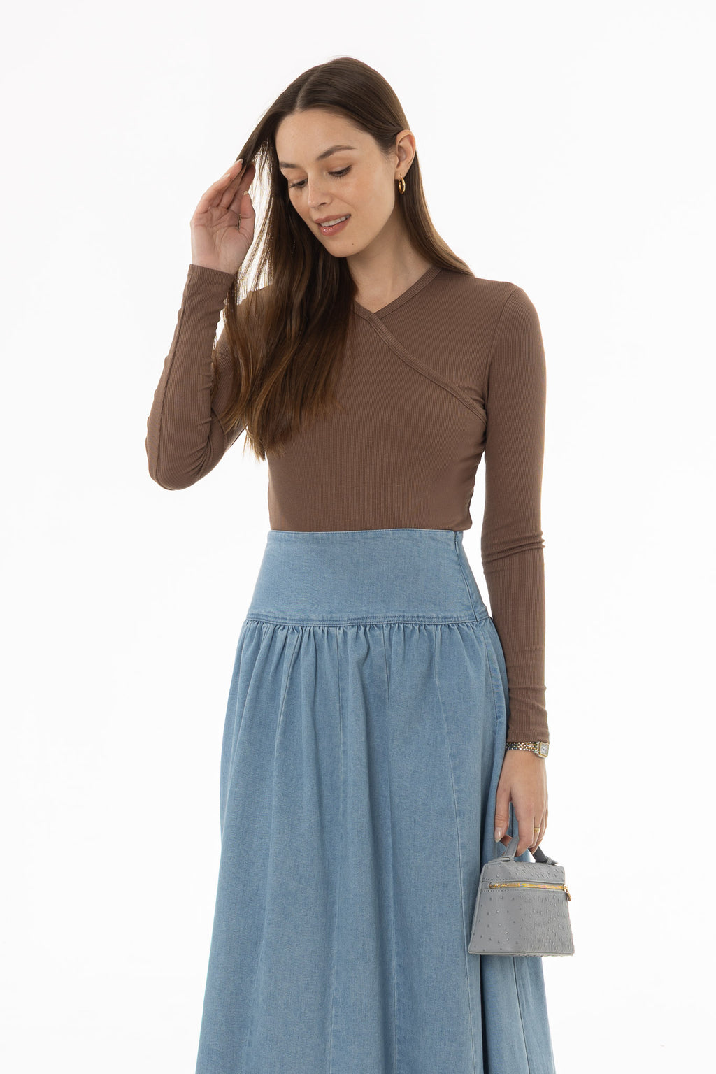 Brown Ribbed Faux Wrap T-Shirt
