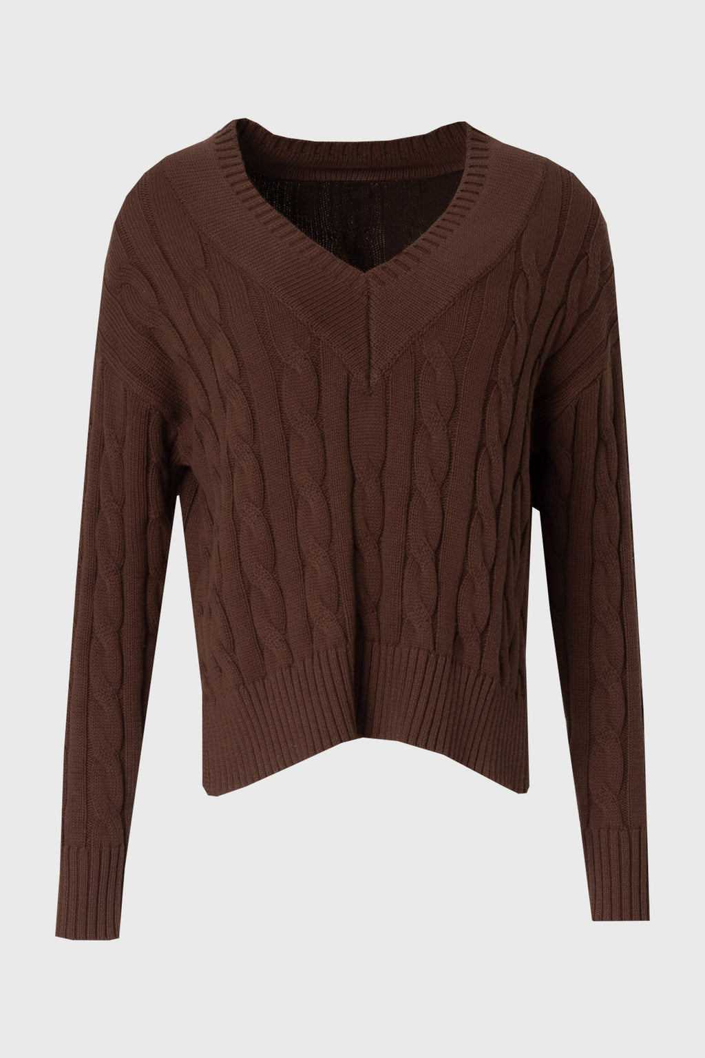 Your go-to sweater just got a little smarter. The deep V-neck keeps it classic, while the chunky cable knit brings that cozy fall texture we all crave. It’s the kind of piece you’ll want on repeat from coffee runs to crisp evening strolls. Slip it on and it instantly feels like fall is here. Style it with a turtleneck top tucked into a denim skirt with boots for an easy, put-together look.