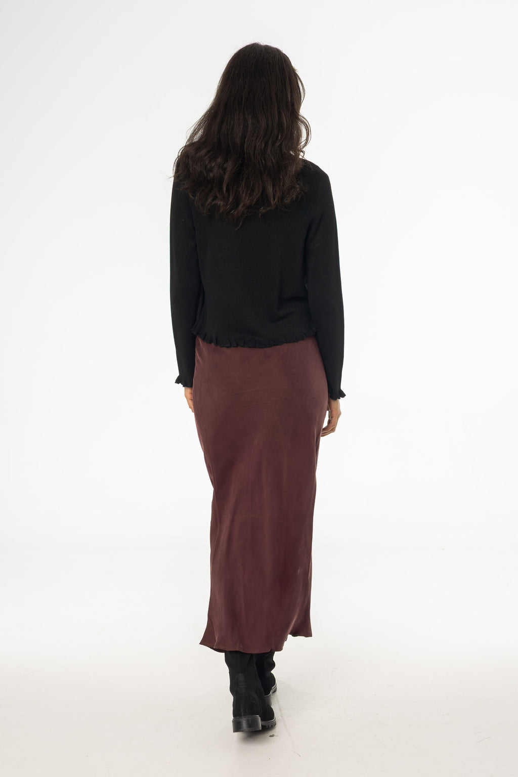A timeless piece with just the right sheen. Easy to pair with chunky sweaters, slip blouse, or even a blazer, it slides into any wardrobe rotation. Its clean shape makes it wearable year-round. You’ll find yourself styling it in more ways than you thought possible.