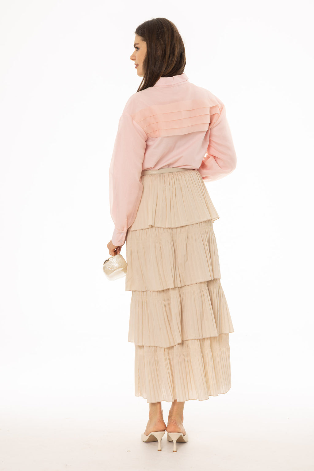 Soft ruffles add movement and a feminine touch as you walk. The lightweight fabric drapes beautifully, creating a fluid silhouette that feels effortless yet refined.