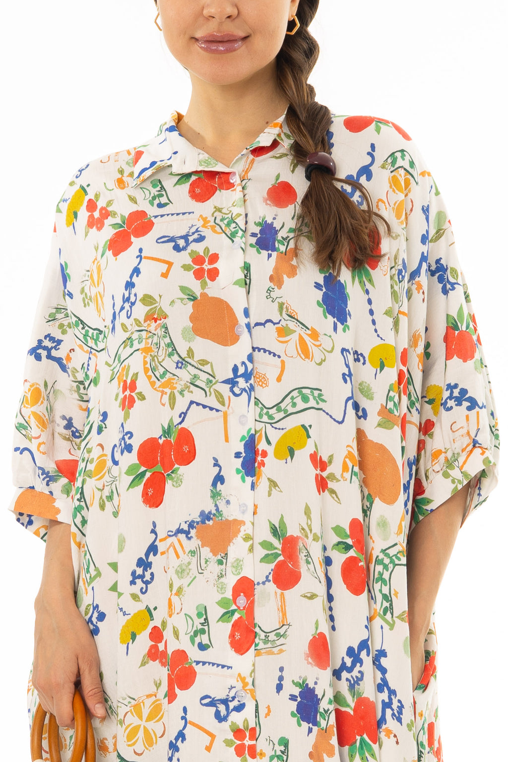 A bright citrus print brings instant energy to this oversized shirt dress. Wear it loose for a relaxed daytime look or add a belt for dinner plans later on. The print makes it feel cheerful and seasonal.