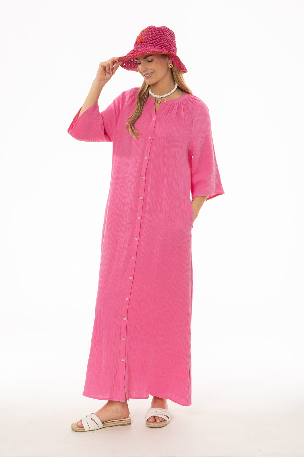 Made from soft gauze fabric that keeps things light in the heat. The flared sleeves add movement and a little drama as you walk. Perfect for beachside dinners or summer evening gatherings.