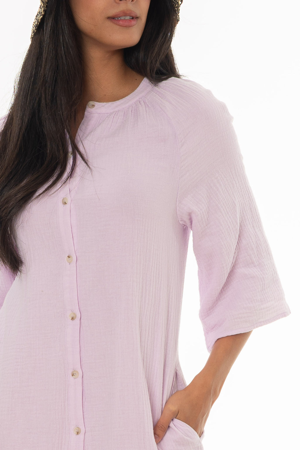 Made from soft gauze fabric that keeps things light in the heat. The flared sleeves add movement and a little drama as you walk. Perfect for beachside dinners or summer evening gatherings.
