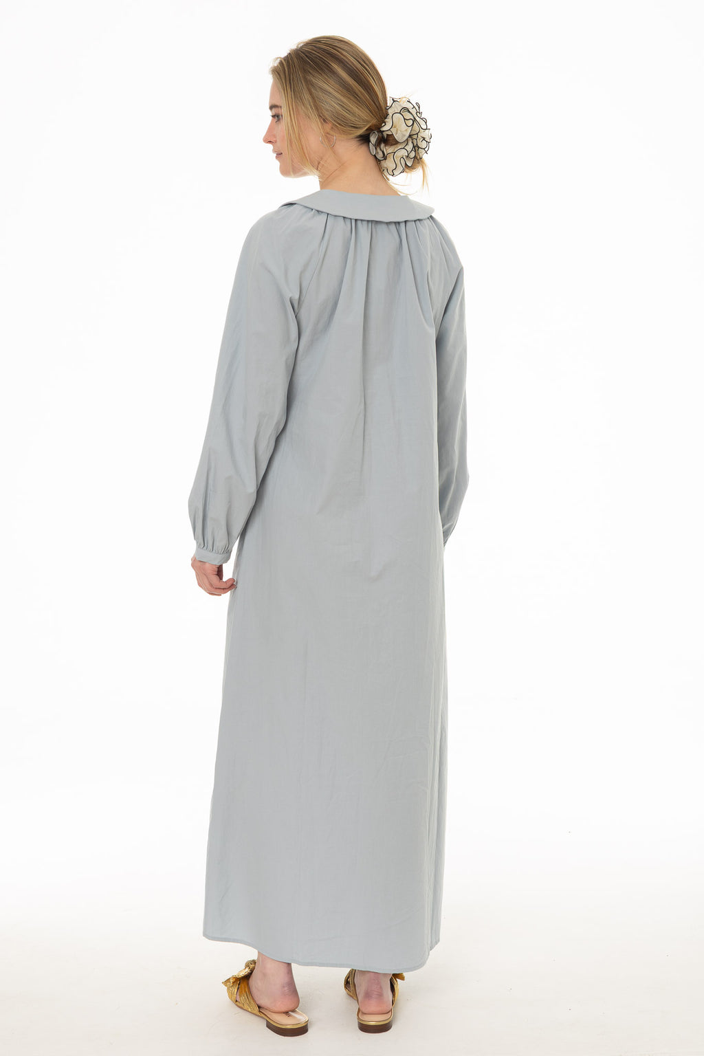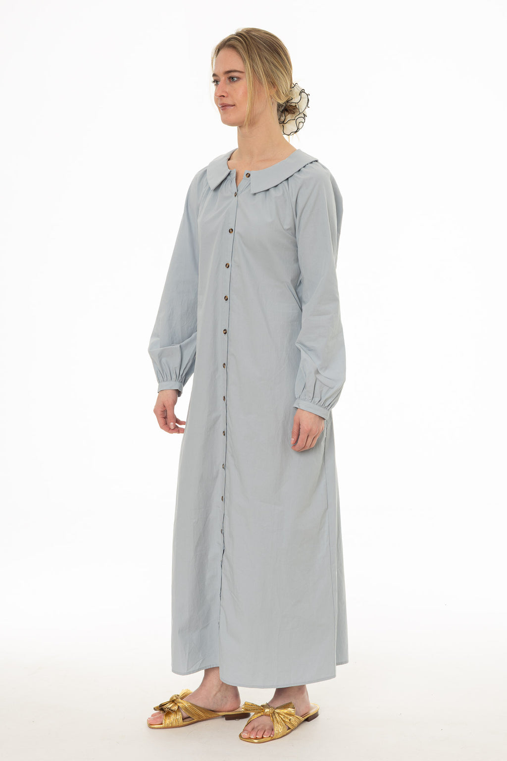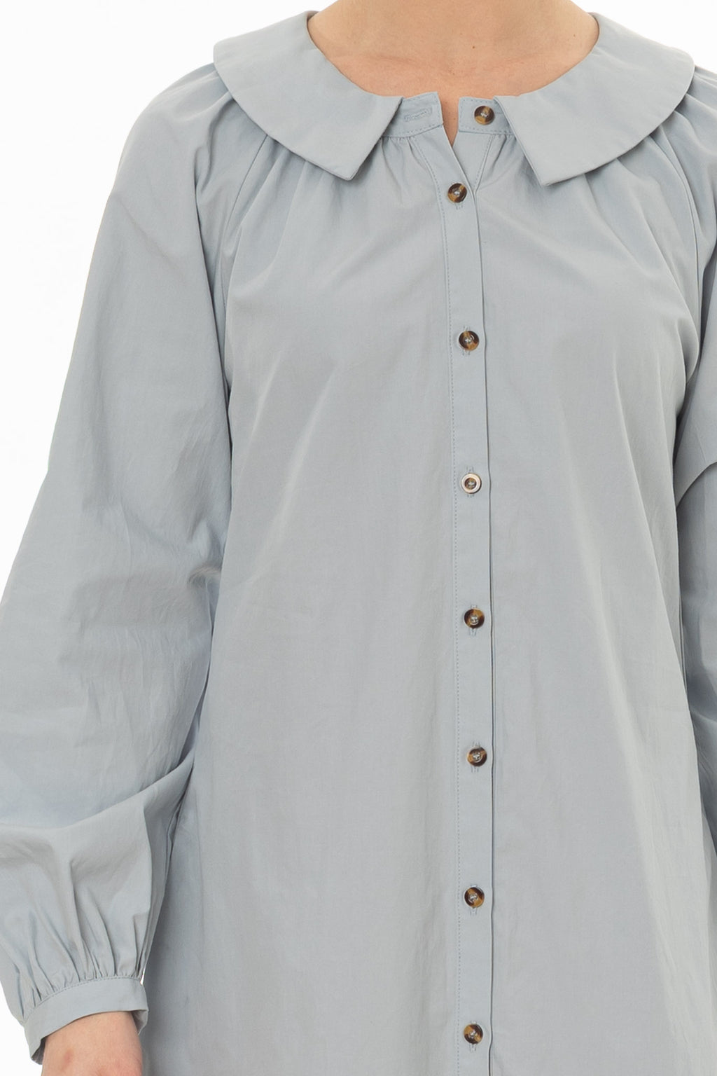 The Peter Pan collar adds a sweet detail to this classic shirt dress. Style it with simple flats and a woven bag for daytime outings or weekend markets. A playful take on everyday dressing.
