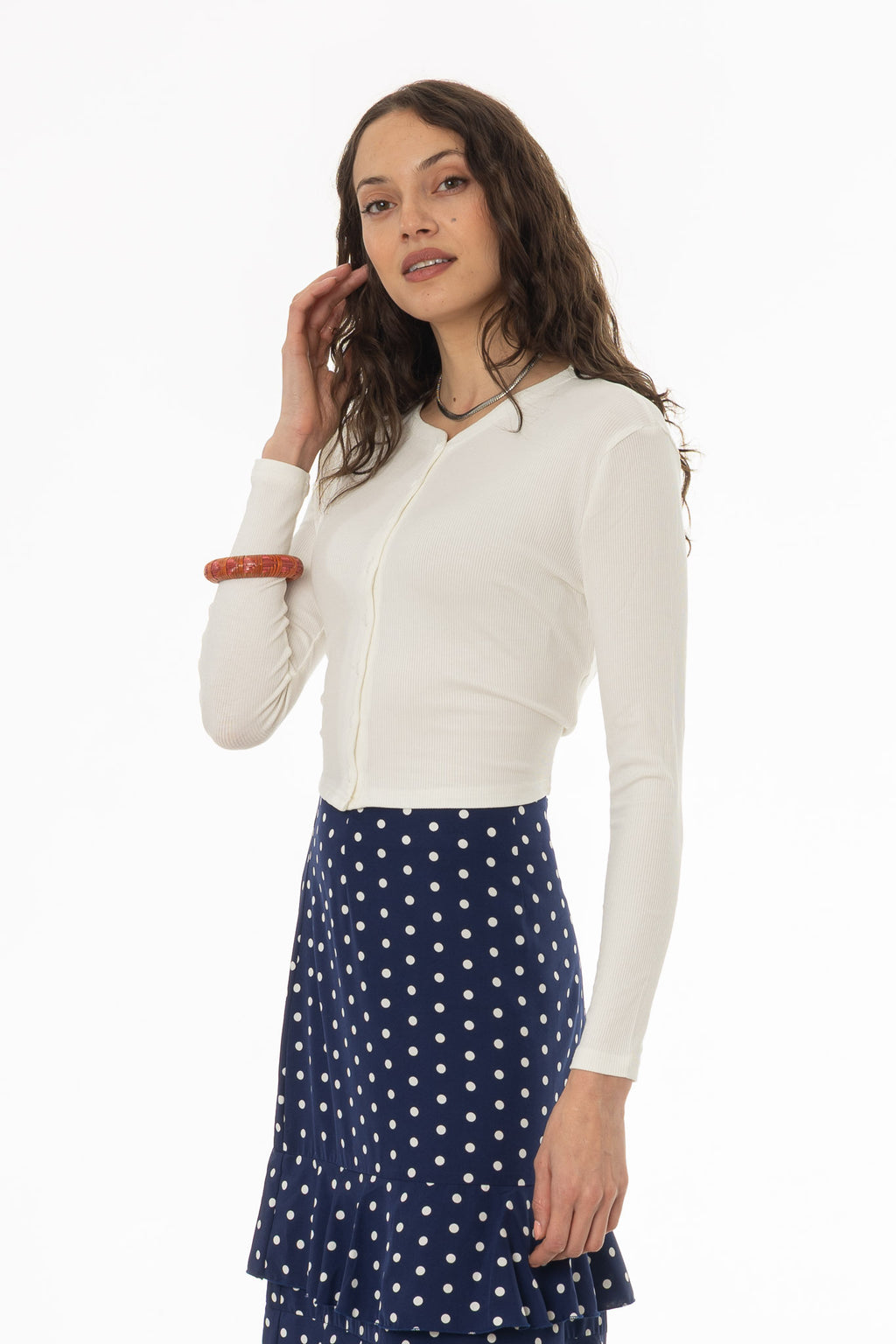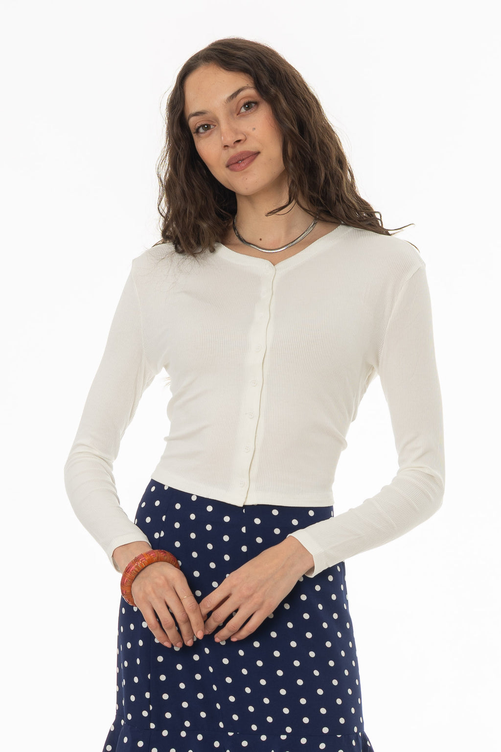 Searching for the perfect layer? Our slim-fitting cropped ribbed long sleeve cardigan is an essential for any wardrobe. Button up in style with matching-color buttons! No wardrobe is complete without a cardi!