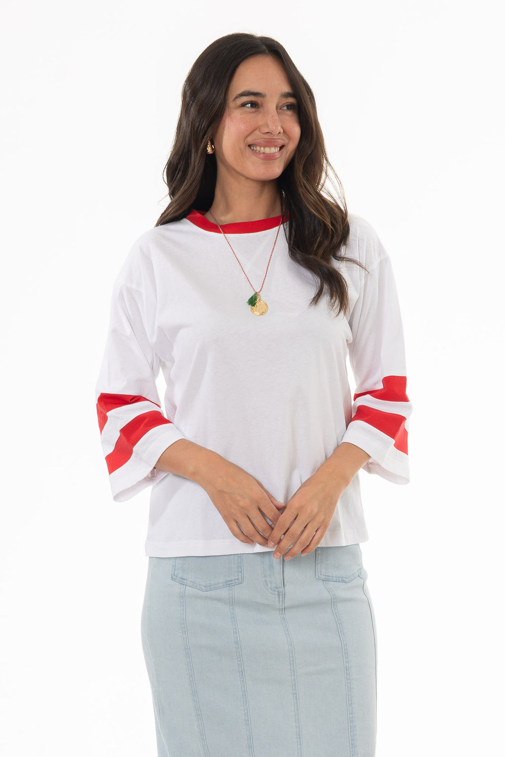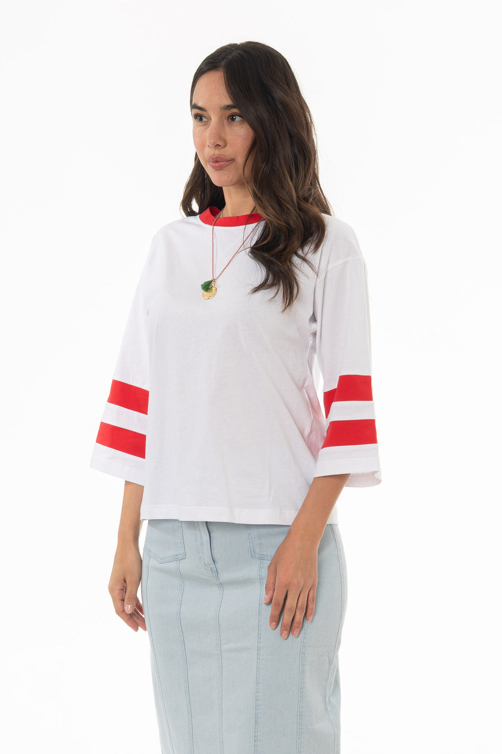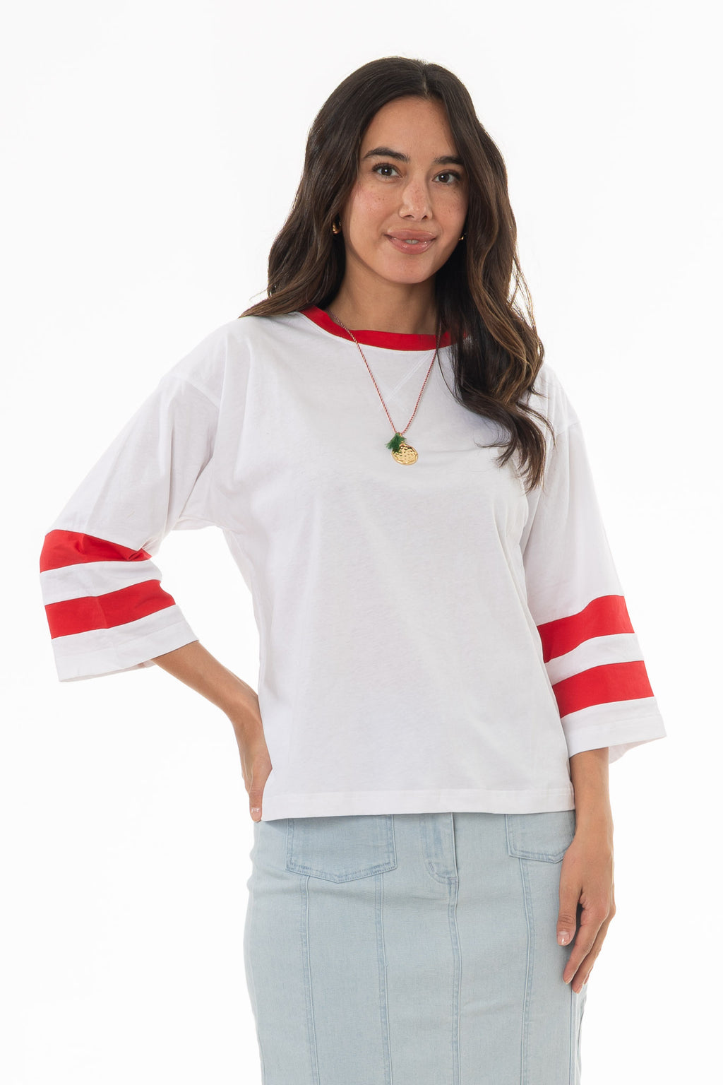 This varsity tee adds a sporty touch to summer styling. Wear it with a long skirt for casual city walks or laid-back weekends. Fun, relaxed, and easy to style.